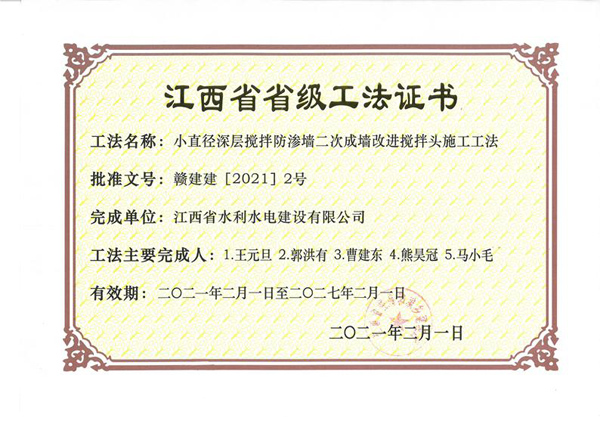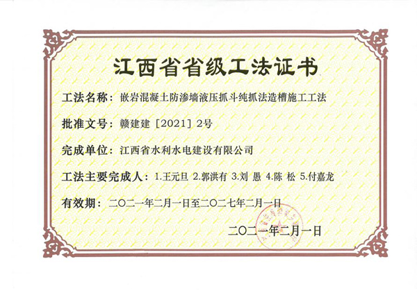 2021年2月1日,江西省住房和城鄉(xiāng)建設廳文件《關(guān)于公布我省2020年度第二批省級工程建設工法的通知》(贛建建〔2021〕2號)公布了2021年度第二批省級工程建設工法評審結(jié)果,其中,公司申報的《小直徑深層攪拌防滲墻二次成墻改進攪拌頭施工工法》、《嵌巖混凝土防滲墻液壓抓斗純抓發(fā)造槽施工工法》審定為“2020年度省級工程建設工法”。