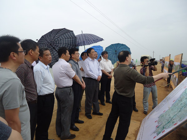 當(dāng)天一大早,董力一行乘船從星子縣出發(fā)趕赴余干縣。在康山大堤鑼鼓山碼頭上岸后,先后來到我司承建完工的鑼鼓山排澇泵站改造工程和康山3標(biāo)工地康山蓄滯洪區(qū)分洪門施工段(KS20+500),并在分洪門施工段(KS20+500)聽取了余干縣水利部門的有關(guān)情況匯報(bào)。在看到康山大堤除險加固工程已進(jìn)入掃尾階段,大堤堤面寬闊,董力表示滿意。