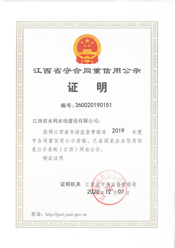 近日,公司獲評2019年度江西省守合同重信用公示資格。