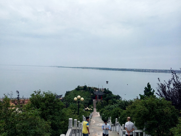 除了饒娥像,其對面的斗笠山也是美景所在之處。入山前,首先看到的是一條由青石板鋪成的臺階,臺階蜿蜒陡峭,兩側是漢白玉雕欄,欄上雕龍繪鳳,栩栩如生。抬頭仰望,只見臺階盡頭是一座高聳的石碑,燙金而書“天下第一碑”幾個大字。一路走走停停到了石碑前,眼前豁然開朗,放眼瞭望,到處一片茫茫水面,碧波蕩漾,翻起碎玉點點。窮極目力,水天一線之間,一座三角錐狀燈塔若隱若現,“浩渺鄱湖水接天,波翻浪涌競爭先;連江通海胸懷廣,滋養生靈歲復年?!庇嗬系摹钝蛾栱灐氛\不欺我。臺階中央又有一小平臺,連接至一片紅墻黃瓦的走廊,廊前紅墻上鑲嵌著墨色的石板,上面刻著一些當代大家對鄱陽湖的見聞和贊譽,筆走龍蛇,字體蒼勁,令人賞心悅目之時不免肅然起敬。走下斗笠山,已經接近傍晚,金日西斜,站在饒娥像后眺望,湖面一片金鱗銀濤,美如油畫。